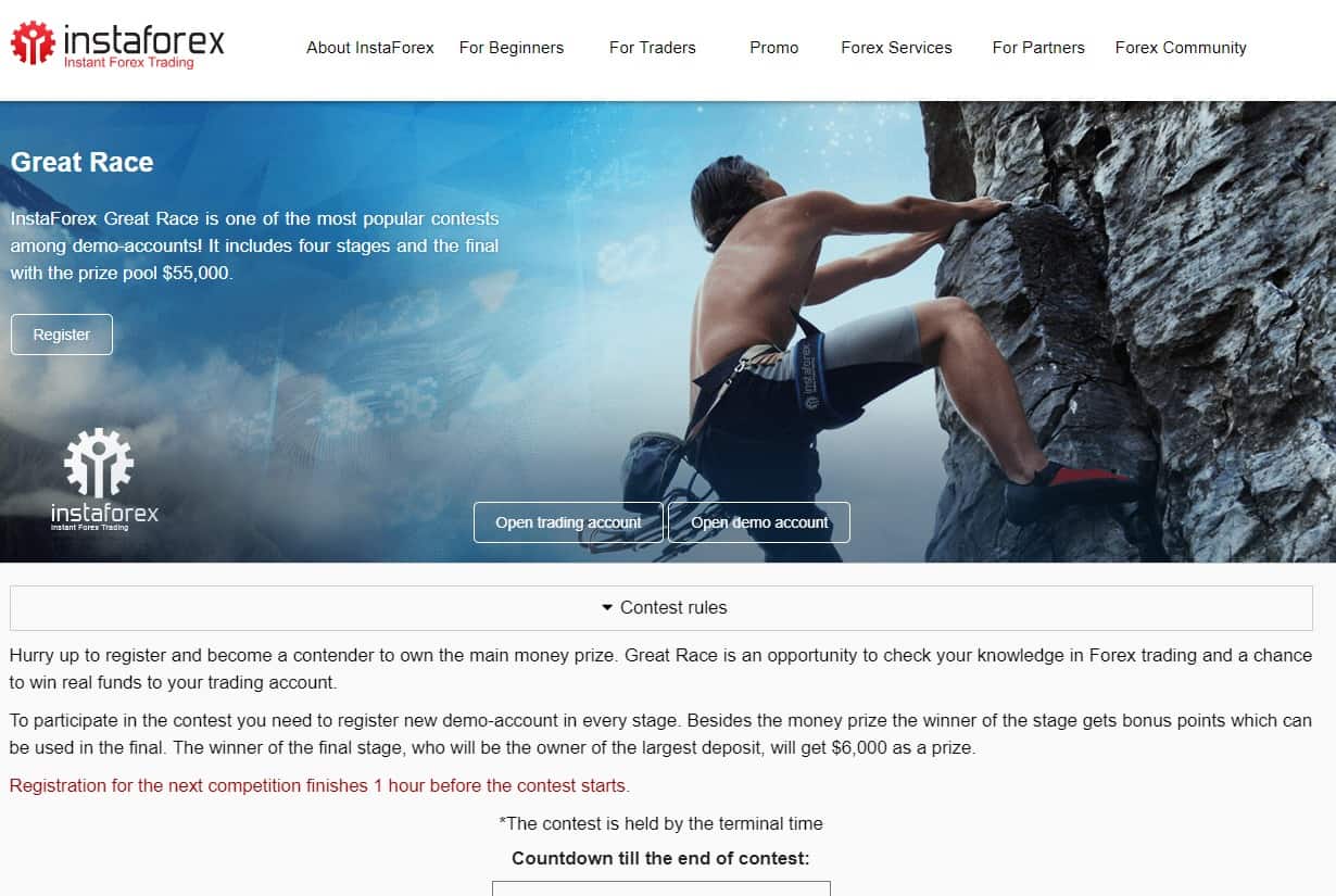 Great Race InstaForex merupakan salah satu pertandingan yang paling popular dikalangan akaun demo! Ia mempunyai empat peringkat dan berakhir dengan jumlah hadiah $ 55,000.